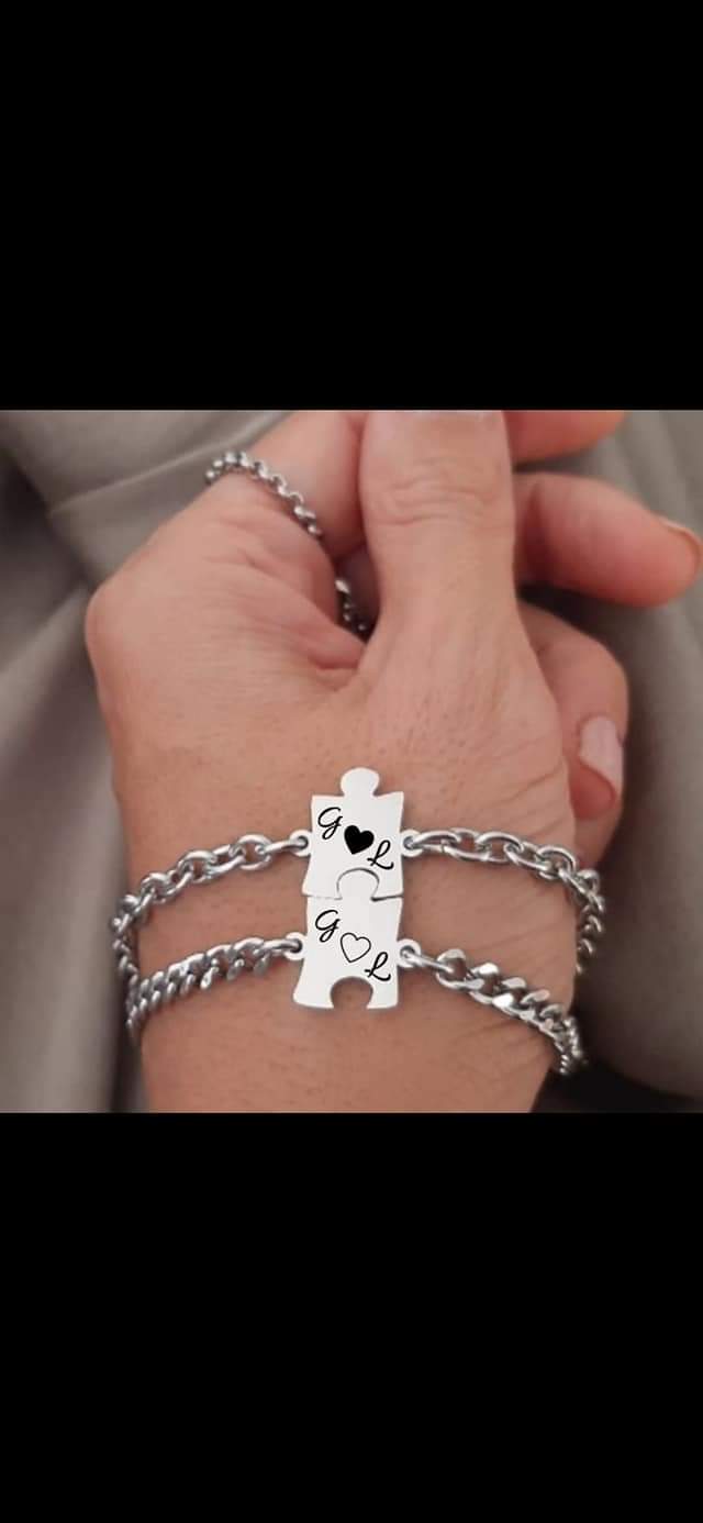 Coppia di bracciali in acciaio inox con puzzle e incisione personalizzata.